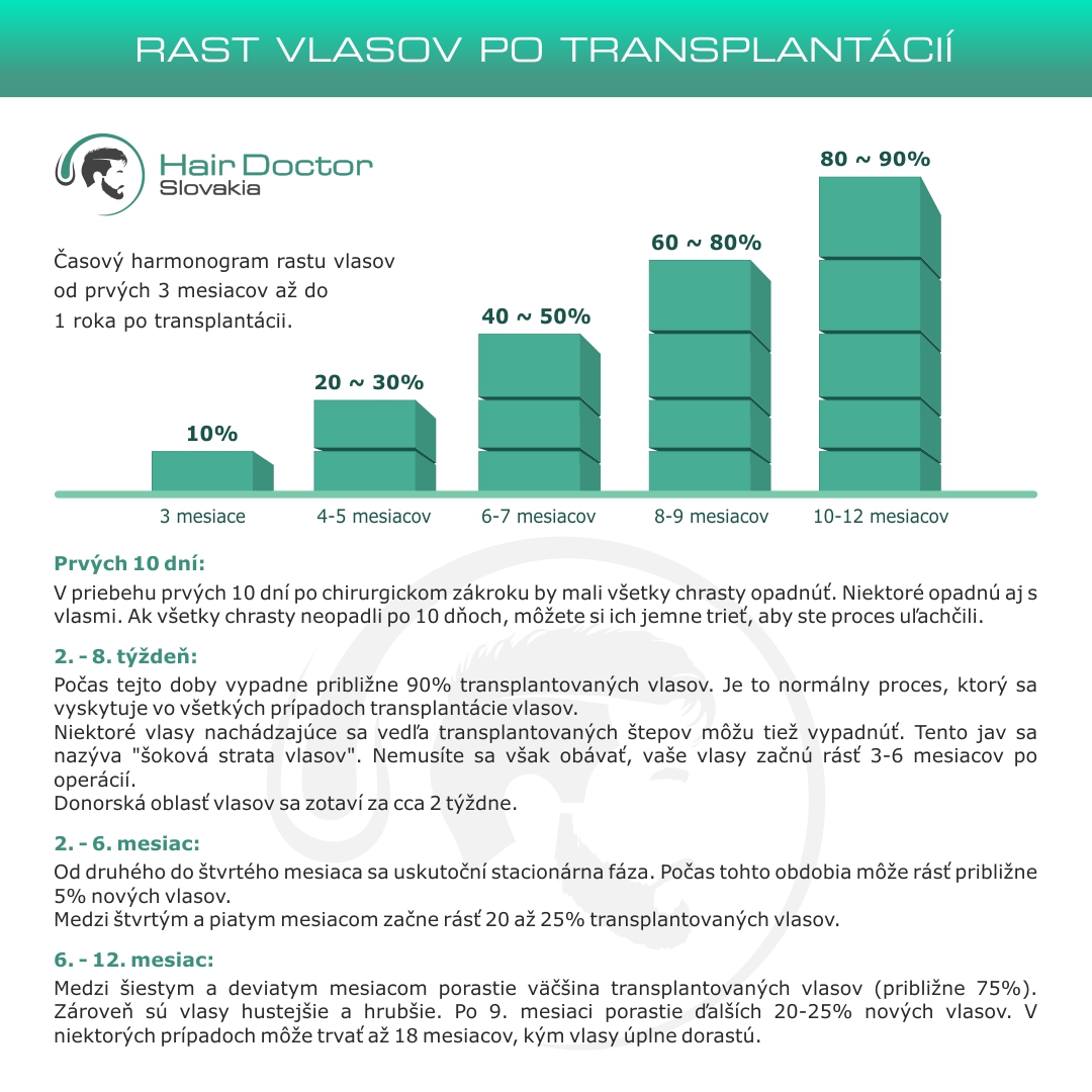 Dva mesiace po transplantácii vlasov končí tzv. šoková strata vlasov a vlasové korienky začínajú rásť. V tomto smere sú prvé výsledky po transplantácii vlasov viditeľné už od tretieho mesiaca. Konečné výsledky je možné vidieť asi rok po transplantácii.